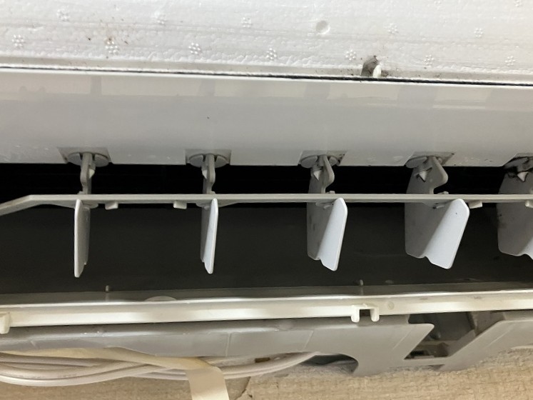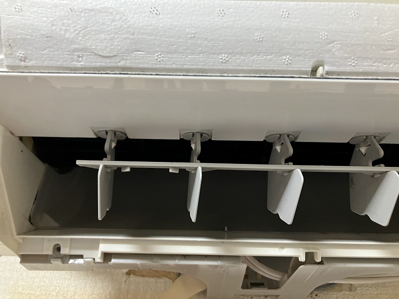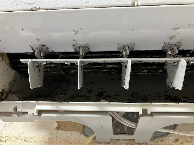 フラップ(吹き出し口に付いている羽)とファン(奥にある筒状の部品)には洗剤をしっかり浸透させ、汚れが強い部分は特に丁寧に洗浄。