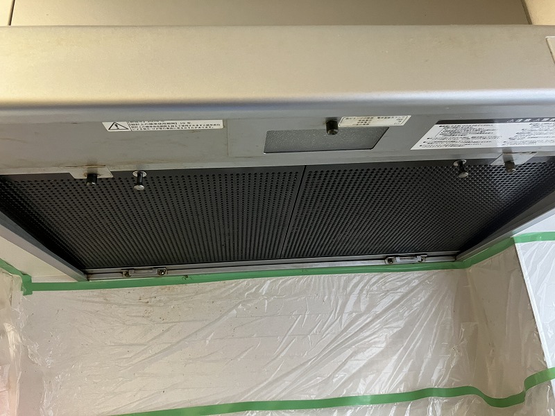 レンジフード周りをしっかり養生したうえで、フィルターカバー・フィルター・シロッコファンを取り外し、60℃のお湯に専用洗剤を入れて浸け置き洗浄を行いました。