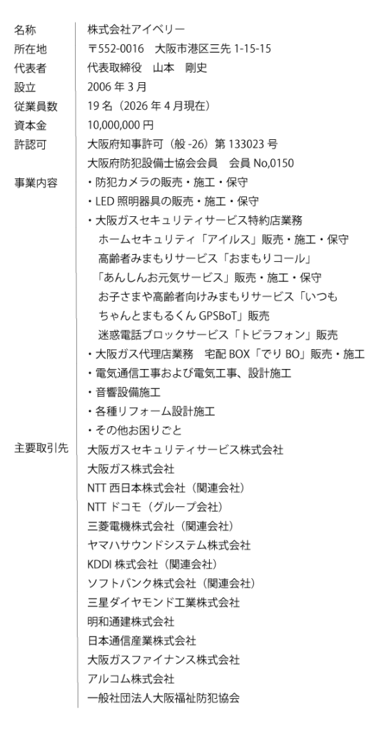 防犯のプロとして公共施設・個人・店舗・集合住宅・自治会など地域の皆さまへ、安全・安心のご提案をさせていただいています。
